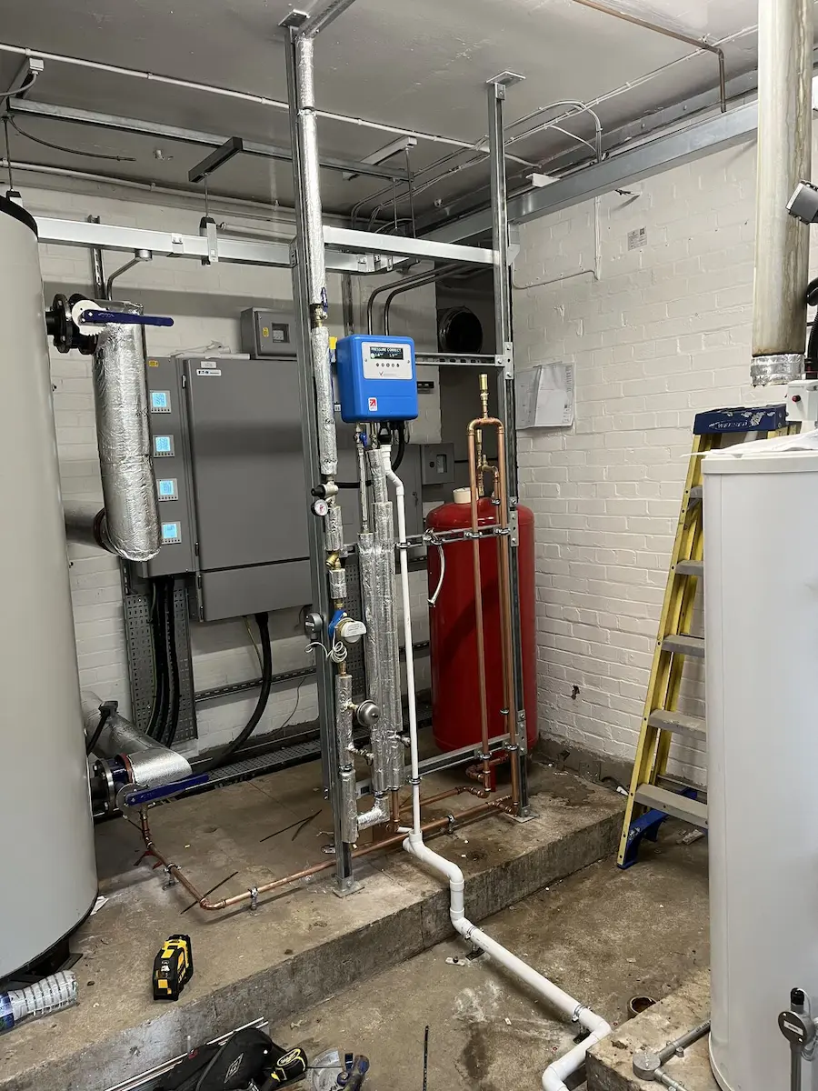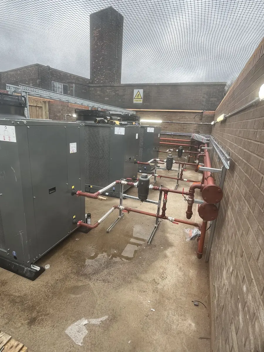 Beyond the heat pumps themselves, this project included a full redesign and installation of the plant room infrastructure.